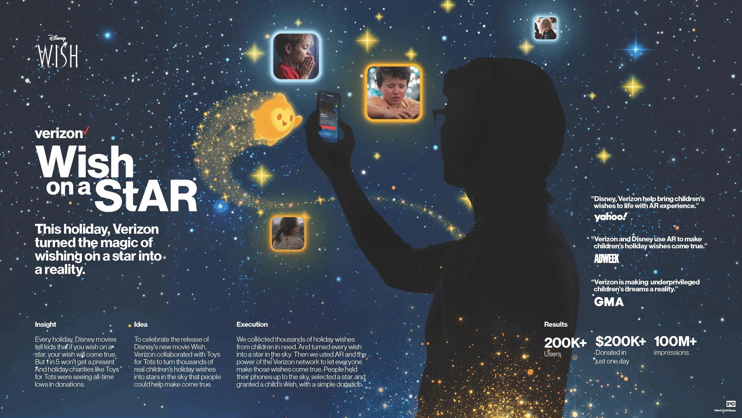 Disney's new movie "Wish" provided a perfect opportunity to give back to children during the holiday season, and Verizon's technology made it an engaging experience. We transformed our environment into a night sky filled with active wishing stars, each star geo-tagged to a local Toys for Tots location. This allowed participants to easily donate and help make a child's dream come true. The results were remarkable—over 10,000 wishes were fulfilled! Scroll down to see the incredible impact we made together.